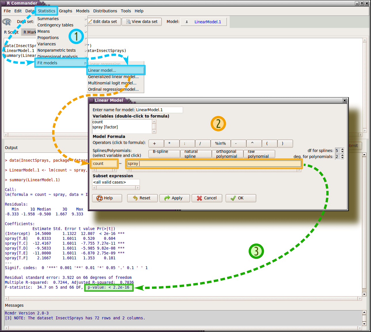 > LinearModel.1 <- lm(count ~ spray, data=InsectSprays) > summary(LinearModel.1) Call: lm(formula = count ~ spray, data = InsectSprays) Residuals: Min 1Q Median 3Q Max -8.333 -1.958 -0.500 1.667 9.333 Coefficients: Estimate Std. Error t value Pr(>|t|) (Intercept) 14.5000 1.1322 12.807 < 2e-16 *** spray[T.B] 0.8333 1.6011 0.520 0.604 spray[T.C] -12.4167 1.6011 -7.755 7.27e-11 *** spray[T.D] -9.5833 1.6011 -5.985 9.82e-08 *** spray[T.E] -11.0000 1.6011 -6.870 2.75e-09 *** spray[T.F] 2.1667 1.6011 1.353 0.181 --- Signif. codes: 0 '***' 0.001 '**' 0.01 '*' 0.05 '.' 0.1 ' ' 1 Residual standard error: 3.922 on 66 degrees of freedom Multiple R-squared: 0.7244, Adjusted R-squared: 0.7036 F-statistic: 34.7 on 5 and 66 DF, p-value: < 2.2e-16