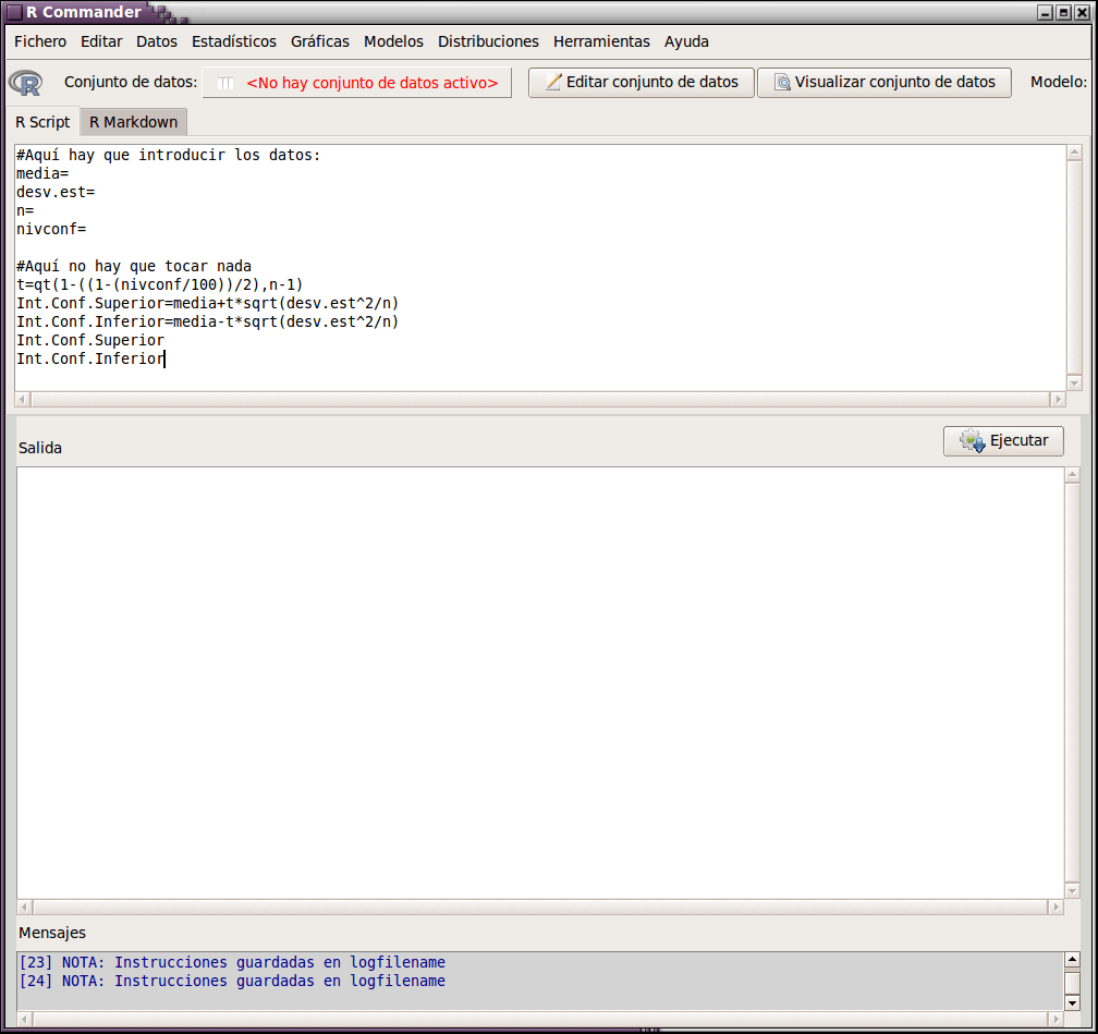Primero, abrimos R commander, y copiamos/pegamos el siguiente código en la pestaña de R Script: